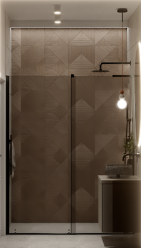 Łazienka została zaprojektowana w ciepłej tonacji. Ściany pokrywają płytki w naturalnym odcieniu, które harmonizują z beżową, frezowaną szafką podumywalkową. Umieszczona na niej umywalka wykonana z kamienia rzecznego wprowadza unikatową strukturę. Konsekwentnym dopełnieniem całości jest czarna armatura, w tym miska ustępowa, nadająca łazience nowoczesnego i wyrazistego charakteru.